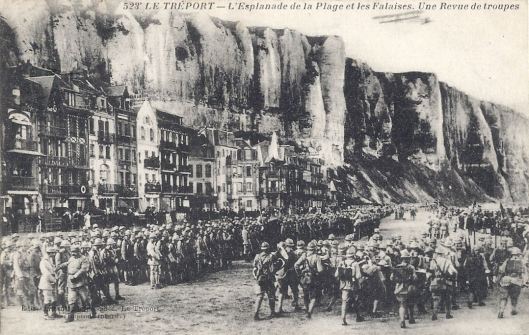 I was amazed to come across this card [below] recently. It was an insight into wartime le Tréport and something I hadn’t ever considered. I thought of the convalescent British and Canadian soldiers venturing out of the Trianon and the huge assembly of associated hospital tents on a warm day, taking in the sea air on the cliff tops, perhaps being able to glimpse the cliffs of England if it was a clear day – and then this, happening directly underneath, this vast number of troops on a promenade to a pleasure beach. The confusion of noise… the feet marching, the orders, the clinking of equipment… the waves relentlessly rolling onto the beach and perpetually breaking on the lighthouse promontory, oblivious to all wars.