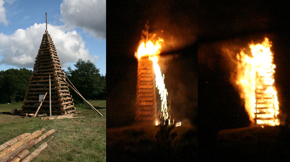 But today… today there are still numerous vestiges of the ghastly war high on this desolate mountain, and today in Alsace is the summer solstice festival, le Feu de la Saint-Jean. Huge structured bûchers, pyramidal pyres of wood, are constructed and burned. The pyres may be up to eighteen metres high and you can see them for miles.