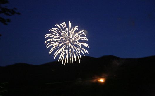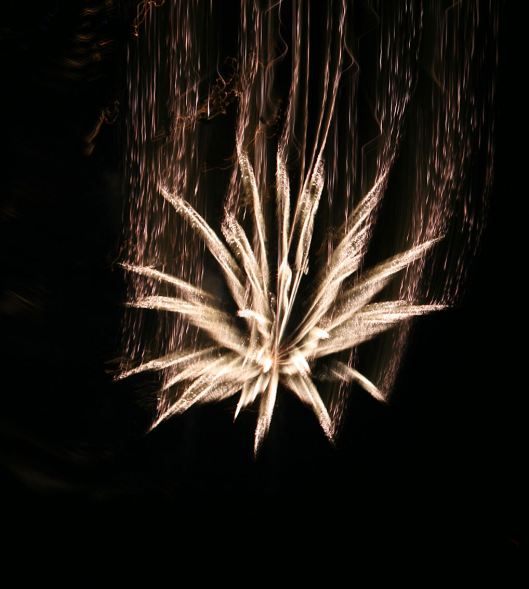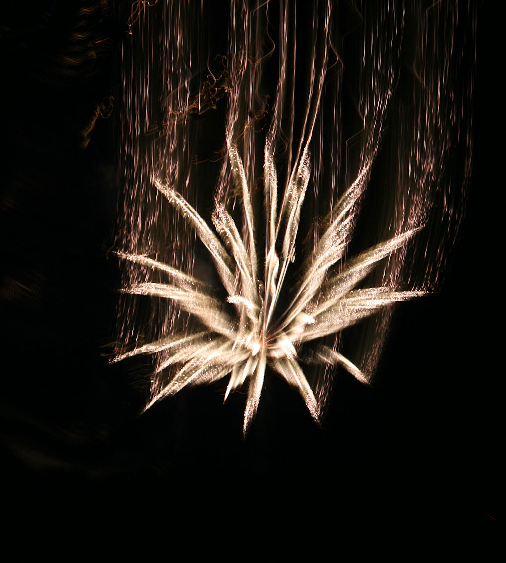 There are explosions over Reichackerkopf tonight. Combustible packets are sent into the air to ignite and shower the landscape with tiny fragments of burning material. Phantom figures run and prance in a mad choreography in front of the fire. The hillside, charcoal, merges into the indigo sky at the horizon and the flare of the sky-fires gives a lightning-brief stream of light.